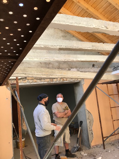 The sound of sawing wood, hammering and loud voices could be heard coming from the direction of the long house. By mid-afternoon we could see that the tiles on the final section of the existing roof had been removed. Raphael came to give an update of what was happening. They had decided not to insulate and waterproof the existing two thirds as no rain had been forecast and they wanted to crack on and get the last bit taken down so that they could start concreting the ring beam. This had become more complicated than first thought, so had taken longer. But we now have a vaulted timber kitchen ceiling and the middle section of the longhouse is boarded ready for the next stage.