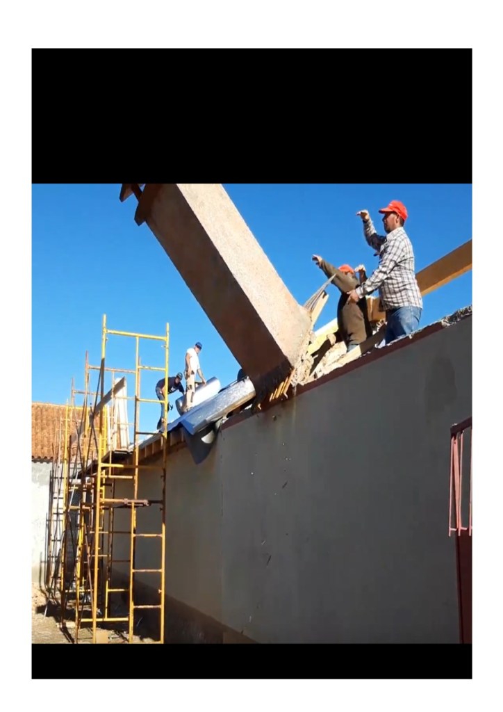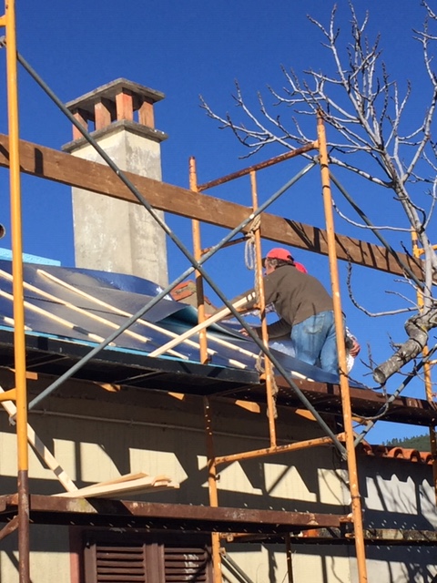 The team were doing well well with the roof getting as much done as possible before the storm came – fixing the layers of waterproofing, insulation and reflective sheeting to help protect everything from the rain. All seemed to be going well when Raphael came to find find us as they had discovered a problem. The original plan was to maintain the chimney stack at the opposite end to the kitchen so that we could create a little snug complete with a log burner to make it warm and cosy. The tiles had been taken off around the stack and found that the only thing that had been keeping it in place and upright were the old roof tiles. The chimney had been built on two pieces of wood which in themselves would have prevented us from putting a flue up the chimney. In addition, the height above the roof was far from the 1 metre minimum requirement. This meant that it was unlikely that we would have ever been able to have functional fire as there wasn’t enough height to create a draw. If by luck we had lit a fire, and it had taken, then the pieces of wood would have probably caught alight and taken the rest of the roof with it. It was agreed that the only real option was to let it go. The two temporary planks which were keeping it in place were removed and it literally took the push of a finger before the whole lot fell to the ground.