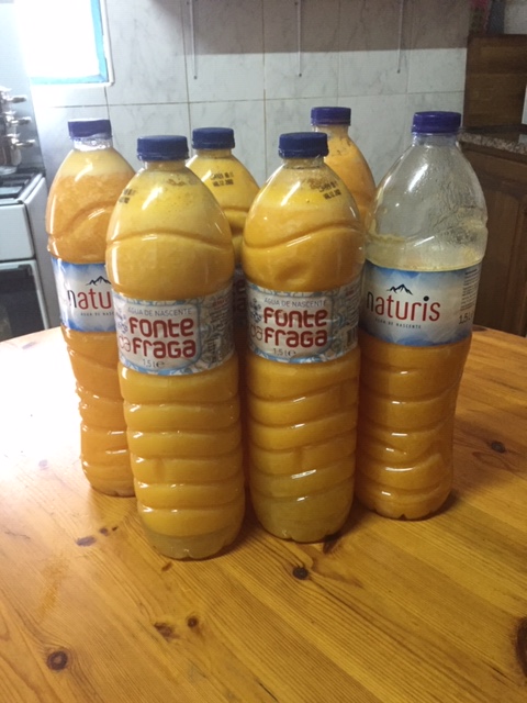 We also wanted to know if oranges grow all year round in Portugal. Although orange trees are evergreen, they do not produce fruit continually throughout the year. Each tree produces one crop of fruit each year, with the fruiting cycle taking up to 10 months for some varieties. However, different varieties have different seasons, either early, mid or late. As this is our first year on the farm, we decided that the best way forward would be to watch and wait to find out exactly which category each of our trees fall into. With an abundance of fruit, our challenge for the moment is to find as many different ways as we can to utilise it. We have already started to create a little frozen storehouse of bottled juice to drink when the trees are bare and over the next few weeks we will be experimenting with cakes, biscuits, preserves and anything else we can think of.
